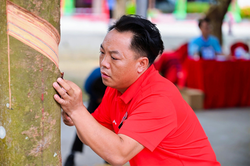 比賽期間,還同步開展了智能機械割膠演示、天然橡膠製品和特色熱作農産品展示等活動,吸引了眾多觀眾駐足觀看。這些活動不僅展示了我國天然橡膠産業的發展成果,也為割膠工們提供了一個交流學習、切磋技藝的平台。