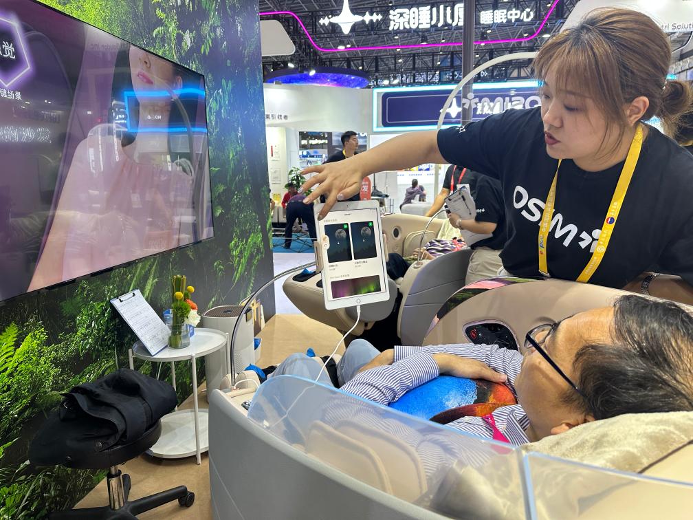 這種趨勢在“艾納詩深睡小屋”展區得到了進一步印證。“深睡艙”內,體驗者佩戴智能眼罩,在聲波頻率引導下進入睡眠。睡眠顧問楊志昊告訴記者,如今大家的健康需求是“更輕鬆更便捷”,“深睡”儀器插電後一鍵開機,甚至可以帶着出差,後&還有醫學機構量身定制睡眠調整方案。