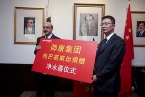 圖為帥康集團凈水器事業部總經理周寵(右)向巴基斯坦駐華大使馬蘇德 汗(左)捐贈凈水器。資料照片 |