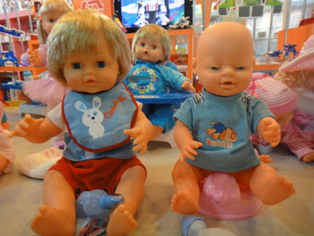 “哇,好萌啊!”在驊威公司的展廳裏,一個來參觀的女孩被模樣超級可愛的娃娃們吸引住了。“這些娃娃,可不單是可愛哦。他們都是智能娃娃,可以溜冰吹泡泡,會拉屎撒尿。”設計師劉元學現場為參觀者演示了一個會“發燒”的娃娃。只見這個娃娃“發燒”之後,滿臉通紅,給它喂各種藥還不夠,仍哭鬧不停,只好給它“打針”“打針”之後,退燒了,它的臉色才恢復了正常。