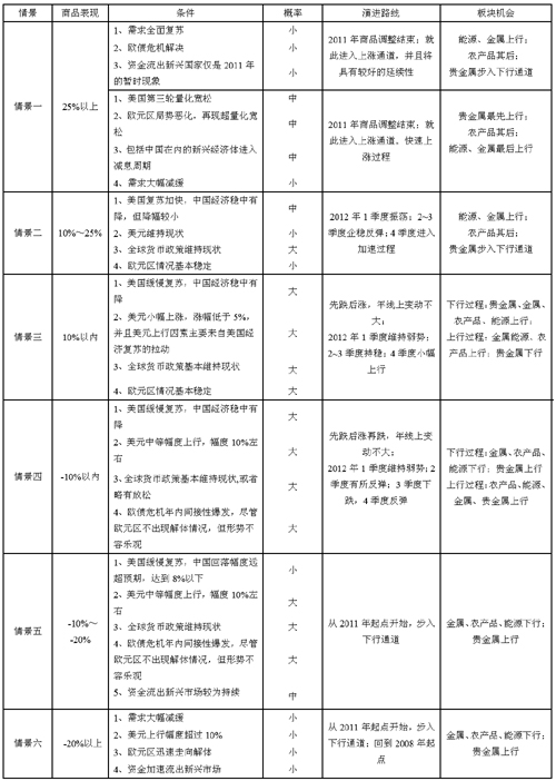 綜合以上分析,我們將2012年商品可能出現的六種情景歸納如下(見表)。我們更傾向於情景四,在上文中也有分析。下行過程中,投資者可選擇的做空産品配置依次是金屬、農産品、能源;在反彈過程,選擇可做多産品配置依次是農産品、能源、金屬、貴金屬。