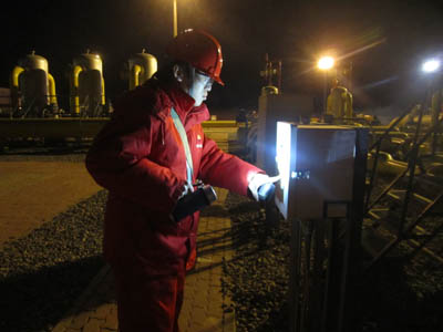 北京天然氣管道公司員工在陜京管道永清站夜間巡查。