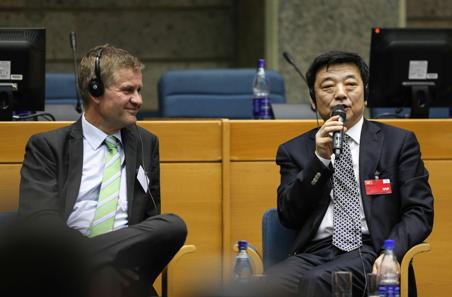 10月28日,中國石化總裁李春光(右)在領導力圓桌會議上回答提問。新華社記者孟晨光攝