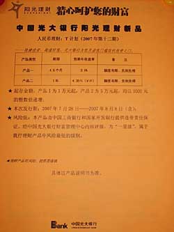 | “陽光理財T計劃”是光大銀行推出的人民幣信託投資理財産品,今年已經發行了12期。本報實習生 唐瑾瑾