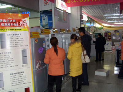 日前,第一批“最省電冰箱”——日耗電0.33度的海爾節能冰箱正式走進農村市場。這是國家實施“家電下鄉”政策以來,冰箱行業推出的最具節能品質的産品。作為冰箱行業最具責任感的企業之一,海爾冰箱在前期的“家電下鄉”過程中,積極推進農村基礎調研,精心分析用戶需求,並推出了三天只用一度電的“最節能冰箱”。圖為消費者正在選購中標“家電下鄉”項目的海爾冰箱。