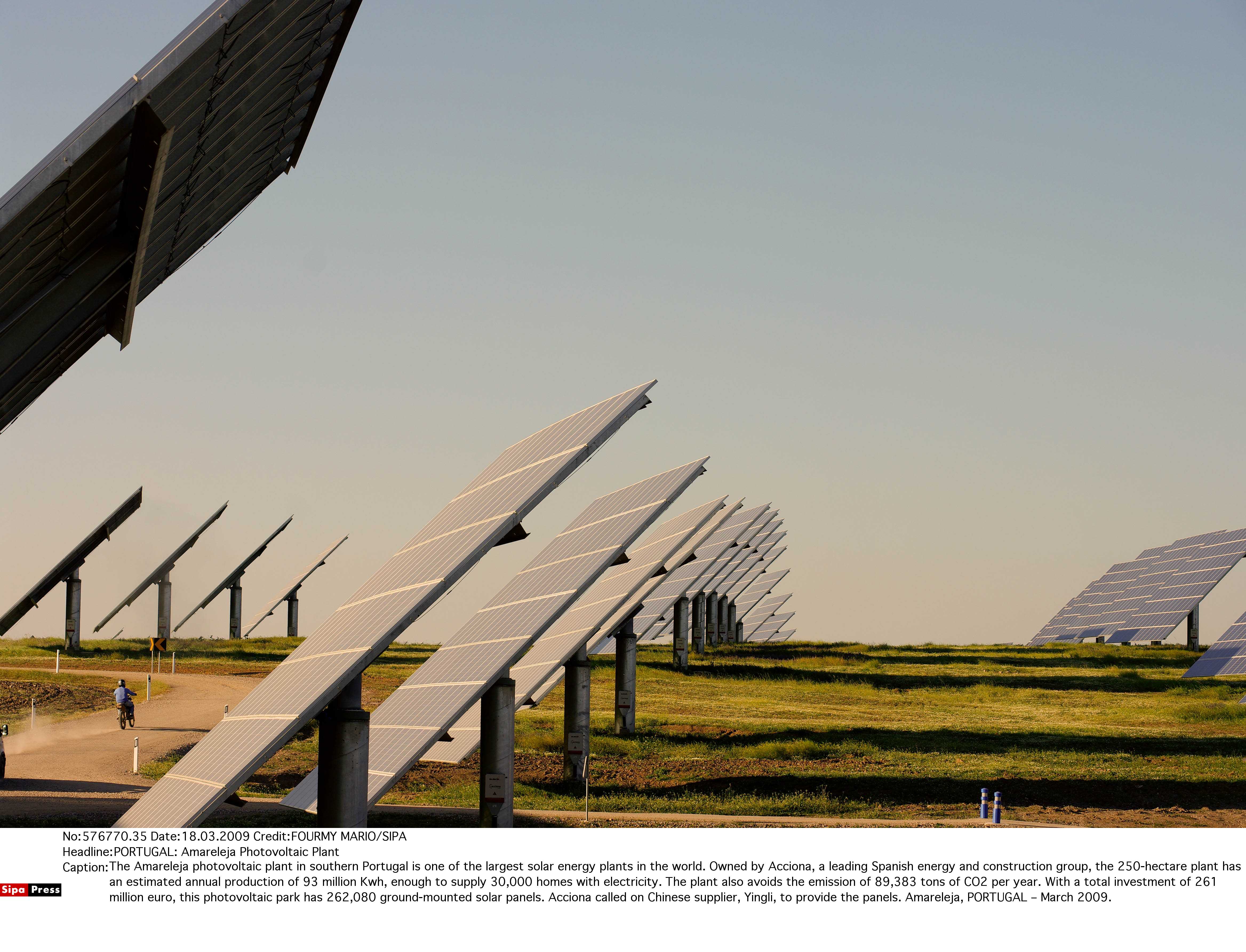 葡萄牙阿馬雷萊雅太陽能發電廠。佔地250公頃的阿馬雷萊雅太陽能發電廠是世界上最大的太陽能發電廠之一,預計年發電量為9300萬千瓦,可供3萬個家庭用電。該廠每年可減少二氧化碳排量89383噸。新華社/西霸