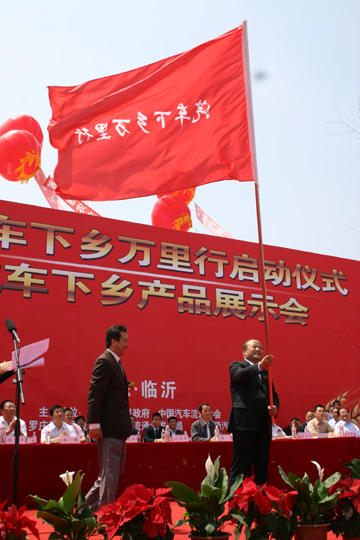 山東臨沂市市長張少軍接過了“汽車下鄉萬里行”活動的旗幟。 |