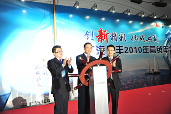 1月18日,廣汽長豐2010年營銷年會在廣州召開。圖為廣汽長豐總經理付守傑帶領兩名大區副總經理為“廣汽長豐巨艦”啟航。李葵枝/攝 |