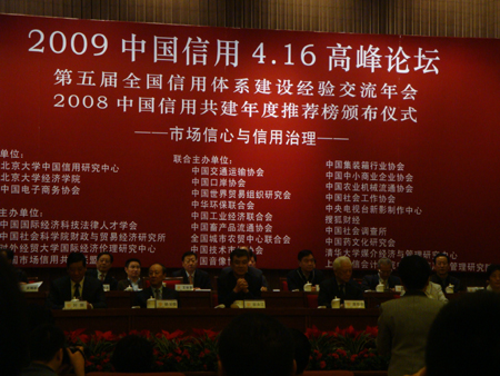 4月18日-4月19日,由北京大學中國信用研究中心、北京大學經濟學院、中國電子商務協會主辦的“2009中國信用高峰論壇”在北京召開,全國人大副委員長周鐵農,中共十二屆中央書記處書記郝建秀出席了會議。來自政府部門和研究機構及全國各地的市長及企業代表500餘人,聚集一堂,探討了我國信用建設的發展現狀和存在的問題,並提出了需要努力的方向。會議重點討論了市場經濟與國家信用制度建設、資本市場發展及信用危機防範、經濟倫理及企業社會責任問題。會議認為,市場經濟的基石是信用,當前發生的世界經濟問題歸根結底是信用出了問題。市場經濟發展需要信用作保障。我國的信用體系建設,經過了10年的努力,取得了很大的進步,但還存在着“高度不高、深度不深、廣度不廣”的問題,尤其是存在着法律上的障礙,各自為政的障礙等等,因此,我國的信用體系建設還需要有一個常態的機構設置,專門的法律、信息的共享機制。有專家認為,政府的4萬億投資將使銀行的信貸大量增加,因此未來的信貸風險將是主要的信用風險。也有專家認為,在未來的城市信用環境評價中,糧食問題將成為重要問題,因為它的很大一部分將成為替代能源原材料。會議啟動了中國城市信用環境評價試點城市,並對2008年中國信用共建年度重信用企業頒了獎。