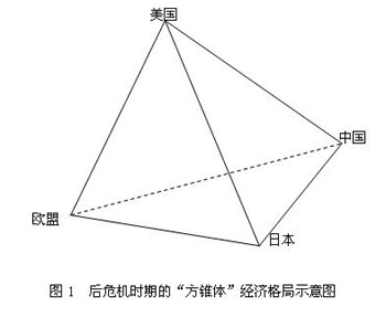 在圖1中,後危機時期的世界經濟格局由美日歐、美日中、美歐中、歐日中等4個“大三角”構成,彼此之間相互&&、相互影響,組成類似“方錐體”的形態。在其中,美日歐“大三角”成為主動和主導“三角”,美國可以通過美日歐“三角”將自己國家的利益協調為集體的利益,將美國的國內經濟政策上升為共同的政策取向,從而通過貿易、資本流動和跨國示範等三個機制向後危機時期的世界經濟注入美國元素。美日中、美歐中等“三角”成為美國權力的穩定“三角”。而中日歐“三角”則是我國在後危機時期進行經濟貿易活動和國際經濟政策協作的重要空間,我國應充分利用並發展好中歐協作機制,謀求必要的國際地位和作用,維護良好的外部環境和國家經濟利益。