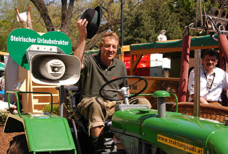 22日,在奧地利維也納,一名參觀者在一年一度的施泰爾馬克州旅游宣傳周活動上試開拖拉機。施泰爾馬克州地處奧地利南部山區,是奧地利的傳統農業州。該州充分利用當地美麗的自然風光資源,大打特色旅游,使旅游業也成為當地的重要經濟支柱産業。