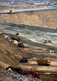 圖為正在建設中的內蒙古哈爾烏素露天煤田。(本報資料照片) | 隨着關閉小煤礦等清理、整合工作的深入,內蒙古鄂爾多斯煤炭基地正朝質量高、秩序好的方向發展,以神華集團為主、地方骨幹企業配套的開發格局已具雛形。 但是,記者近日在鄂爾多斯市採訪中了解到,鄂爾多斯在建設國家煤炭基地的過程中,也存在着布局規劃落實難、開發工藝比較落後和利益分配嚴重失衡三大突出問題,並由此導致企業之間、企業與地方政府和礦區居民之間矛盾尖銳。當地政府有關部門和骨幹企業的負責人建議,國家應完善相關政策,科學開發,保護資源。