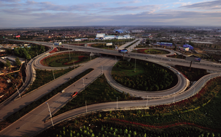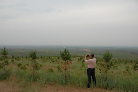 ▲大圖為一位游人正在朔州西山公園高處攝影。左上小圖為西山公園與市區連接的公路。七、八年前,這裡還是成片的荒山荒坡,起風就揚沙。