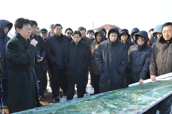 2010年1月,渤海海峽跨海通道課題組成員和國家發改委、交通運輸部、鐵道部等國家部委研究人員共同到蓬萊考察、調研工程線路、登陸地點。左二為蓬萊市市長張代令,左七為渤海海峽跨海通道課題組副組長、魯東大學副校長、環渤海發展研究中心主任柳新華教授。資料照片 |