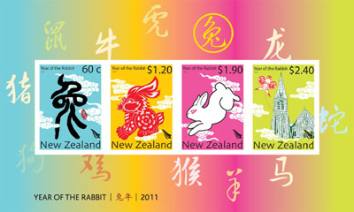 為慶祝辛卯兔年,新西蘭郵政局將於2011年1月12日正式發行兔年紀念郵票。這套兔年郵票包括一套4張面值為60分、1.2新西蘭元、1.9新元、2.4新元郵票以及小型張,首日封,郵戳和集郵套裝。兔年郵票由新西蘭華裔設計師李勃以及他的團隊“勃亞傳播”設計。圖為將由新西蘭郵政局發行的兔年紀念郵票小型張。
