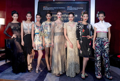 香港貿發局日前舉行香港時裝節及香港國際時尚薈萃新聞發布會,公布活動詳情。本次時裝盛會將於1月17日至20日舉行。圖為模特在新聞發布會上進行時裝精選預展。