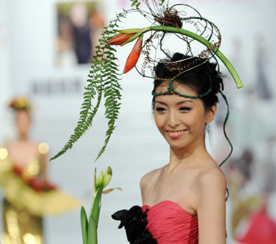 一場花藝婚紗秀日前在&&花博會亮相,婚紗秀以節能減碳、環保、生態為主題,採用環保、生態材料、植物以及花卉等素材裝飾婚紗禮服。圖為一名模特在T&上展示花藝婚紗。