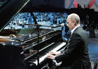 在聖彼得堡慈善晚會上,主持人邀請普京上&表演,普京説:“如同大多數人一樣,我不會唱歌跳舞。”然而,他走到&上一架鋼琴前,用那強健的十指以及略顯尖薄的聲線自彈自唱起來。當然,世人無不稱給力,無不感嘆當年克格勃培訓系統的水平之高。