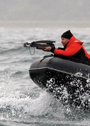 在堪察加半島海域飛馳的橡皮快艇上,普京趴在船頭射鯨,這是為了取得一小塊鯨魚皮膚用作科研。當射中後,普京相當興奮,對記者大喊:“我射了4次,終於射中了。”而出現在中文媒體的標題則是:《普京射鯨》。還射了4次。