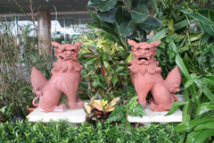 石獅子自中國傳到琉球後,深受琉球人喜愛,直到現在,沖繩也處處可見各種材質的獅子身影,不僅門口擺着獅子,屋頂站着獅子,墻上鑲嵌着獅子,橋欄上蹲着獅子,櫃&上也放着獅子,連手機鏈都是獅子,沖繩人對獅子的喜愛可見一斑。
