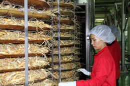 戴上頭套和腳套,我們懷着好奇的心情走進工廠,一一觀看各道生産工序。天然的人參經由機器清洗後,通過傳送帶被送至蒸箱,完成了最關鍵最核心的蒸參環節後,顏色變紅,又通過傳送帶,被碼放到曬盤。自然晾曬20多天后,再由有經驗的工人手工篩選,分為天、地、良三種級別。其中,天字號紅參為頂級,是上等的國禮,據説在1995年中國國家主席訪問韓國時,韓國贈送了10支“天參”。