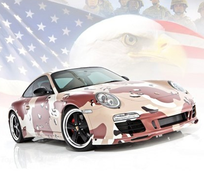 這款保時捷(Porsche)911特別版與普通版本不同,它的外觀以迷彩軍裝裝飾,點綴的褐色、米黃色和白色的搭配設計靈感來自在荒漠作戰的美軍制服,同時汽車還配備一套新的空氣動力套件,車尾部分也經過重新設計,讓性能得到了進一步的提高。外觀上的另一個特點,就是這&911左右兩側的輪轂。雖然同樣採用鍍鉻金屬邊作為裝飾,但是左邊的輪轂為多輻條式設計,而右邊的輪轂則為五輻條式設計,相當特別。內飾部分,Champion
