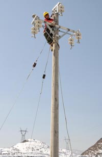 2月22日,在雲南省昭通市,一名工人在搶修冰雪災害中損壞的電力設施。