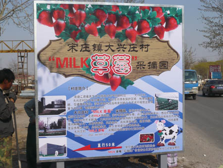 通州區移動公司為大興莊樹的草莓採摘園廣告宣傳牌。這是村官孫璐珺與通州區移動公司“談判”的成果。 3、