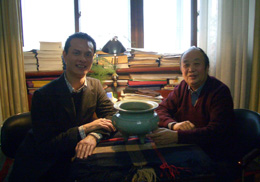 趙青雲(右)為歐洲古董經紀(左)鑒定宋瓷。 |