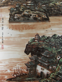 圖為《神州頌》局部、畫家苗重安創作的《龍門古渡》。 |