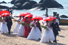 據一組織集體婚禮的網站負責人介紹,從去年5月組織第一屆集體婚禮起,該公司已經組織了180對新人在三亞舉行集體婚禮。隨着婚禮形式的不斷豐富,通過電話和網站諮詢的年輕朋友也越來越多。 在該公司推出的婚禮産品中,記者看到了分界洲島海底婚禮、三亞灣畔草坪婚禮、黎族婚宴等形式多樣的獨特婚慶內容。 三亞市旅游部門有關人士&&,隨着三亞旅游的不斷發展,婚慶産品成為三亞旅游産業鏈條中蓬勃發展的一環。一系列結合三亞環境和當地文化的婚禮形式不斷應運而生,受到現代年輕人的歡迎。