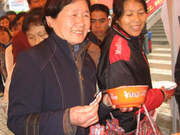 福建省漳州市總工會、中國移動漳州分公司近日在漳州火車站為因天氣影響滯留的旅客和外來工送上禦寒棉衣、棉被、方便麵,同時為旅客提供免費電話等服務。圖為滯留人員有秩序領取方便麵。