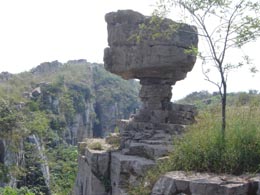 在山東沂蒙山區的蒙陰縣界牌鎮塌崖山頂峰,有一尊“火炬石”,其狀貌與熊熊燃燒的火炬極其相似,讓人不由不驚嘆大自然的鬼斧神工。 這塊奇石位於界牌鎮南3公里處的塌崖山頂峰,遠看像一個正在燃燒的火炬。“火炬石”上端直徑約2米,根部直徑僅約0.3米。巨石立於一點,看似搖搖欲墜,但多少年了,歷經風霜雪雨的侵蝕而不倒。 據介紹,“火炬石”周邊區域已被當地開發成為集民俗、休閒、娛樂、觀光於一體的綜合性生態旅游區,成為沂蒙山區旅游的一個新亮點。隨着北京奧運會日益臨近,越來越多的游客到“火炬石”旁邊留影。 地處沂蒙山區的臨沂市是遠近知名的“中國奇石之鄉”,特別是這個市的費縣境內,奇石眾多,千姿百態,妙趣橫生。