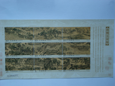 清明是我國的二十四節氣之一,也是我國的傳統節日之一,是拜祖和掃墓的日子。清明節又叫踏青節、寒食節。清明節始於周代,至今已有2500多年的歷史。2008年,國務院決定清明節為法定節日。 北宋時期,我國畫壇出現了一幅繪畫精品,它就是畫家張擇端創作的傳世之作《清明上河圖》,這幅畫畫幅浩大、藝術精湛,被人譽為“千古大觀、人間異寶”,現存北京故宮博物院。屬一級國寶。為了使這幅精品繪畫,讓更多的後人欣賞到,中國郵政在2004年10月18日將它搬上了方寸,發行《清明上河圖》郵票1套9枚(志號為2004-26) 《清明上河圖》原畫長528.7厘米,全畫自右至左,大體分為三個部分:其一是寧靜廣闊的鄉村、汴京郊外的春光;其二是繁忙的汴河漕運碼頭;其三是繁華的都城汴京城,熱鬧的市區街道一角(今河南開封)。畫面布局合理,有張有弛、有巰有密、有條有理、繁而不亂,充分展現了北京政和年間清明時節的一派繁榮昇平景象。 這套郵票的設計和印刷很有特色,將5米多長的長卷壓縮在這套郵票中,惟一的辦法是選擇畫中的部分,以特寫鏡頭的手法,將郊野、漕運和城市選切入郵票中,然後有序的排在一個小全(版)張上,而中間部分也是全畫的高潮部分,水陸交通、城鄉溝通放在郵票的正中地位,起到一目了然、以小見大的效果,具有較高的設計與印刷水平。