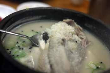 今年夏天的異常高溫,讓幾乎半個地球的人都難以忍受。該吃些什麼來消暑呢?涼滋滋的雪糕?冷颼颼的冰飲?還是苦哈哈的綠豆湯?看看韓國人的另類祛暑秘方吧——熱乎乎的大補參雞湯! 參雞湯,顧名思義,就是有“人參”的“雞湯”,為韓國第一補湯。該湯製作講究,為達到嫩而不柴、香而不膩的效果,要選擇不大不小、一斤多的6周齡童子雞,將其充分洗凈後,在腹內塞滿韓國高麗人參、黃芪、當歸、枸杞、大棗、板栗、大蒜、糯米等數十種藥材,經過數小時的精心燉制,湯汁變白變濃,出鍋時撒上香噴噴的蔥花、芝麻即成。一道雞湯,既有湯又有肉還有飯,清淡鮮美,滋補營養,堪稱高效。 這道湯裏最重要的部分——人參,在中國醫藥裏,一般只適合於産後、術後氣血大虛之人。可是在韓國,人參是男女老少健病皆宜的食材,備受推崇,因此各種人參製品,如人參糖、人參糕點、人參茶、人參湯、人參酒、人參蜜等隨處可見。經濟能力許可的老人還會每隔一段時間拿切成片的新鮮人參蘸着蜂蜜直接入口吃。儘管如此,大夏天的,將如此大補之物入口,還是令人詫異。可韓國人卻認為,正因為是夏天,人體因出汗多而消耗能量、營養,吃了參雞湯,體內積聚的廢物隨汗水排出,而讓人參雞這樣滋補的東西墊底,才有益身體健康。因此,每年入伏之後“參雞湯”就是韓國人必吃之補品。 據行家介紹,參雞湯所使用的是未經加工的新鮮人參,俗稱水參,能起到“涼補”的作用。同時,富含蛋白質的雞肉有溫中益氣、補精添髓、補虛益智的作用。紅棗富含維生素,板栗富含氨基酸,能補腎補氣,糯米性味甘溫、入脾腎肺經,可益氣健脾、生津止汗。這些性質溫和的輔料搭配在一起,經過完美熬煮,融為一體,具有大補元氣、固脫生津之功效、適用於勞傷虛損、食少、倦怠、健忘、眩暈頭痛、陽痿、尿頻、氣血津液不足等症,正好可以滿足夏季進補的需要。 在韓國街頭,有不少參雞湯專營店,而位於首爾景福宮附近的“土俗村”是最有名的。這裡一年四季都人滿為患,如今天已入伏,每天門口都排着長龍,不等上半個小時別想吃上令人心心念念的參雞湯。 近日,記者也懷着好奇之心,耐心等候了足足半個小時,終於嘗到了這美味的大補湯。 一坐下,店家先送上一杯人參酒。這人參酒雖然只有一小杯(四錢左右),可是濃厚的參味讓人不得不慢慢品、慢慢抿。隨後,裝在瓦罐裏的參雞湯上桌了。只見奶白色濃濃的雞湯裏漂浮着點點的瓜子、芝麻和蔥花,整只小小的童子雞肉泛着淡淡的粉色,一看就引人食欲。 小心地下筷,夾起一些雞肉,長時間的燉煮早已將雞肉煮得酥爛無比,且充滿了藥材的清香。平素因嫌雞肉肉質幹硬而不愛吃的記者也吃得津津有味。掀開雞肚子,裏面軟軟的糯米因浸透了雞湯,變得微黃,仿佛沾滿了鮮香的雞油,放進嘴裏入口即化。雞肚子裏,還有小半根早已軟爛的山參。一口吃下,感覺自己一下子精力倍增。而最精華的部分,當然就是那濃湯了。經過幾個小時的燉煮,雞肉、人參、紅棗等的營養早已融入其中,加上該店獨特的秘方湯料,清淡的鮮美無與倫比,雞肉的鮮香、紅棗的甜香、人參的清香……和諧交融,簡直難以言説。 |