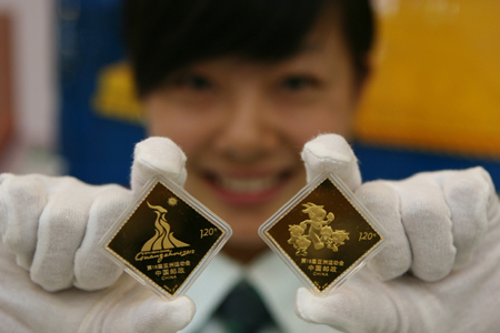 為迎接廣州亞運會開幕,8月4日,廣州亞運會開幕倒計時100天,經中國郵政集團公司批准,第十六屆亞洲運動會組委會授權,中國集郵總公司特別發行《第16屆亞洲運動會會徽和吉祥物郵票金磚》一套兩枚,每枚25克,統一編號CJ.P-4,以此為弘揚“激情盛會、和諧亞洲”的主題貢獻力量,同時也為滿足廣大民眾紀念和收藏亞運的心願提供高端文化品。 金磚正面以《第16屆亞洲運動會》郵票為主圖,按原大尺寸分別將會徽郵票和吉祥物郵票鑄造於Au.9999純金之上,同時採用高浮雕、淺浮雕、鏡面等多項貴金屬製作工藝,在金磚上雕刻出靈動飄逸的亞運會徽和熱情奔放的亞運吉祥物立體造型,圖案線條自由流暢,形象自然生動;每枚金磚背面均印刻産品發行編號及限量編碼,且兩金同號,確保産品發行的惟一性和權威性。 此套金磚最大發行量3000套,每套金磚配發含特殊版式郵票的收藏證書一份,證書編號與金磚編碼一一對應。 據悉,到目前為止,中國集郵總公司共發行了四套郵票金磚,即建國60周年紀念——《開國大典》郵票金磚、生肖文化收藏——《庚寅年》郵票金磚、上海世博主題紀念——《世博會》郵票金磚和此次發行的廣州亞運主題紀念——《會徽和吉祥物》郵票金磚。 |