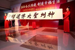 4月17日——北京奧運會倒計時113天之際,中國文體明星北京奧運宣傳助威團和北京奧運會燃氣具獨家供應商中山華帝燃具股份有限公司在國家體育總局隆重召開以奧運聖火傳遍中華大地為主題的書畫巨作《神州聖火傳遞圖》、《神州聖火傳遞頌》創作面世暨郵品發行新聞發布會。 《神州聖火傳遞圖》、《神州聖火傳遞頌》分別由113幅繪畫和113幅書法作品構成的兩部巨作,表現了113個火炬傳遞城市的風光、人文、地域特徵,每幅均獨立成篇,組合起來就是完整的奧運聖火傳遞路線。據統計本次共有書畫家逾300人參與了兩幅巨著的創作,徵集書畫作品400多幅。