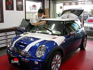 專家建議為汽車安裝貼膜最好到專業店。 圖為在北京一家“龍膜”授權施工連鎖店,“龍膜”技師正在為汽車安裝前擋膜。Lois