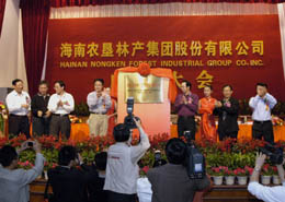 海南農墾林産集團成立大會上,海南省省長羅保銘(左四)和海南農墾總局局長王一新(右四)揭牌。(韓勤