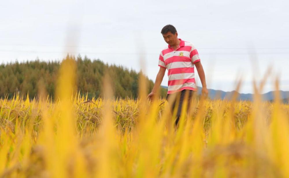 在遼寧省撫順市新賓滿族自治縣新賓鎮的水稻田裏,農民丁輝查看水稻成熟情況(2023年9月25日攝)。新華社記者 楊青 攝