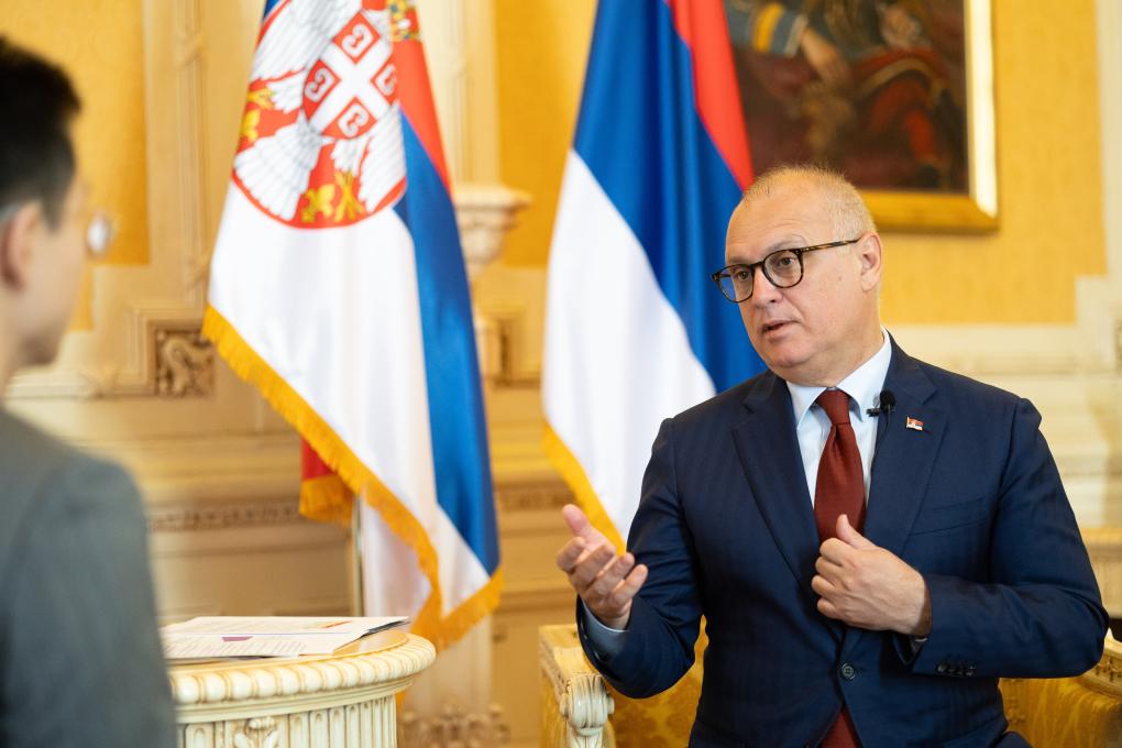 2日、セルビアのベオグラードでインタビューに応じる同國のベシッチ建設・運輸・インフラ相。(ベオグラード=新華社記者/李京)
