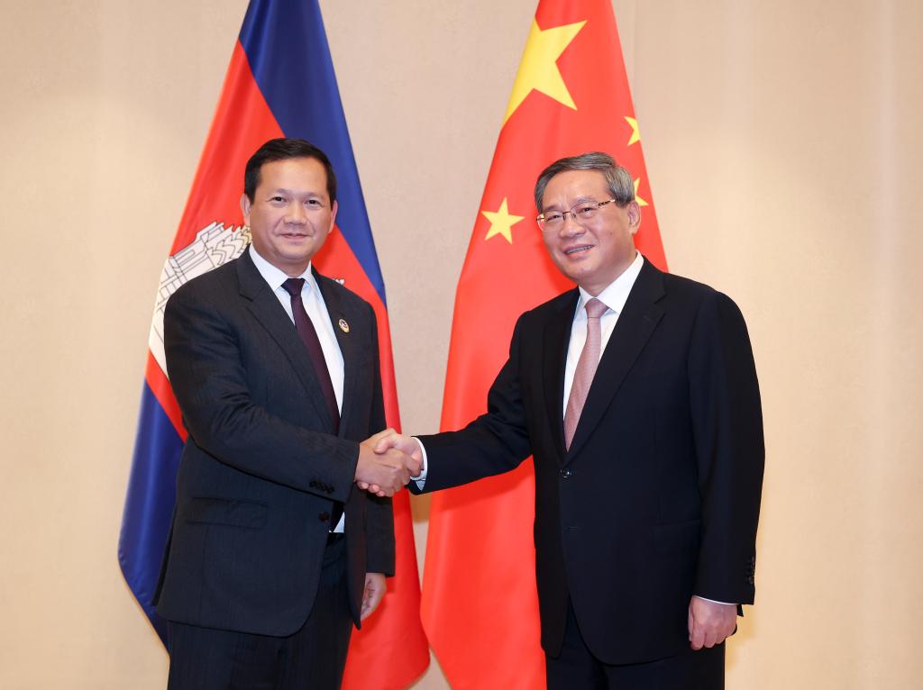 中國の李強(り・きょう)國務院総理は10日、東アジア協力関連首脳會議出席のため訪れたラオス・ビエンチャンで、カンボジアのフン・マネット首相と會談した。(ビエンチャン=新華社記者/丁海濤)