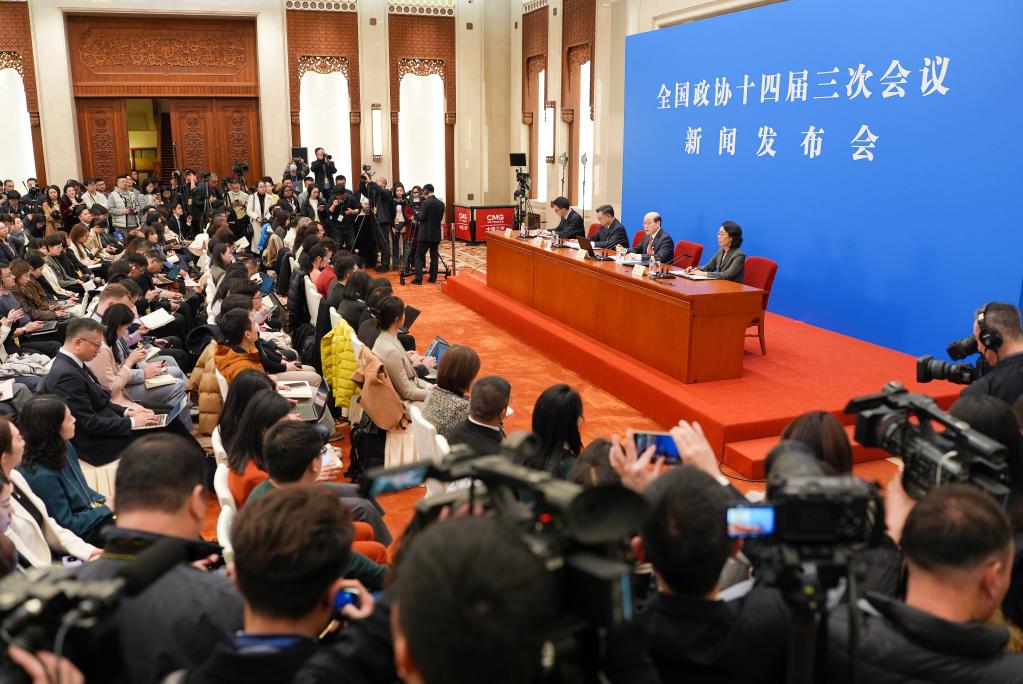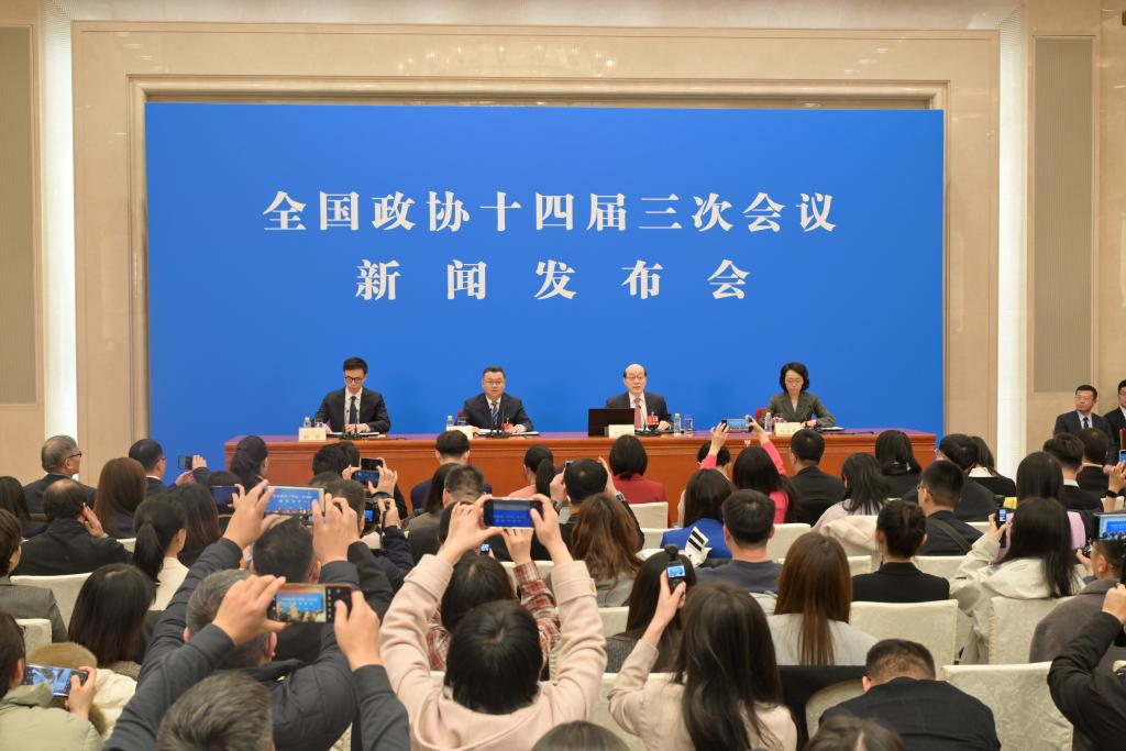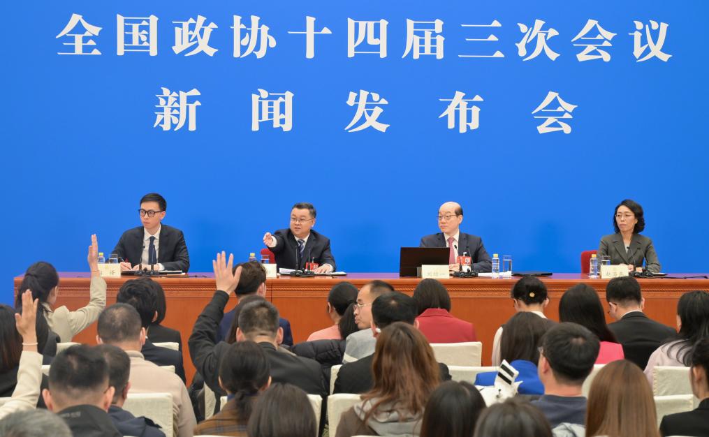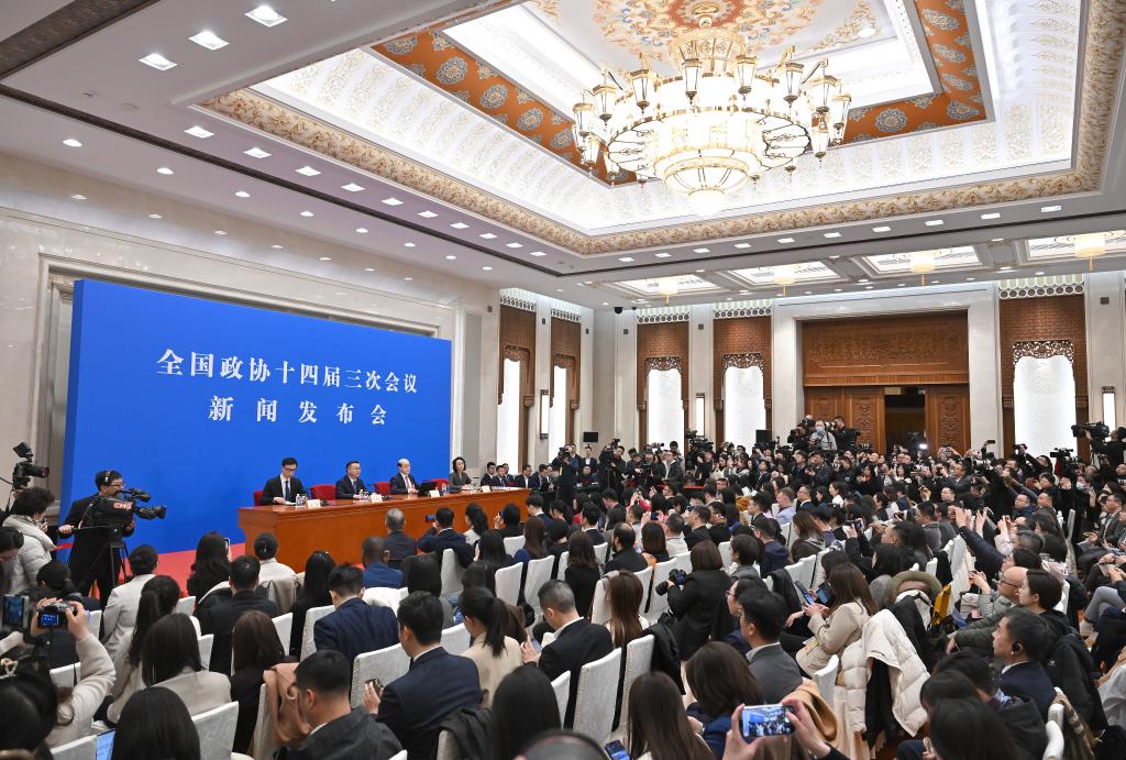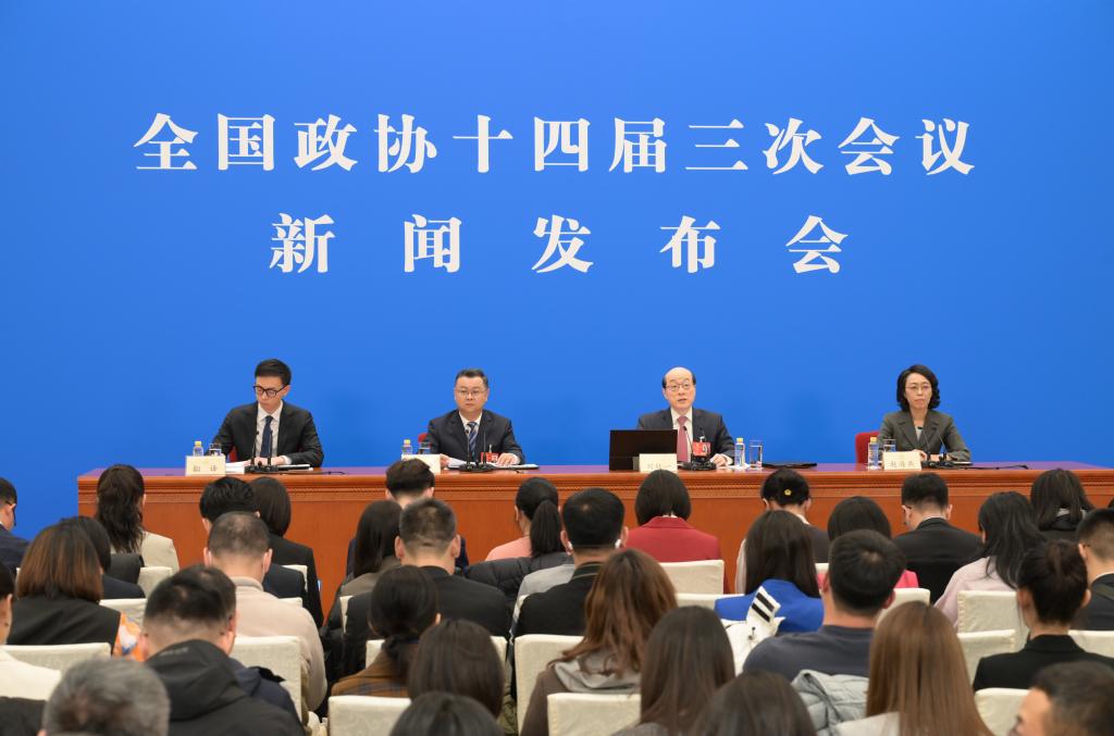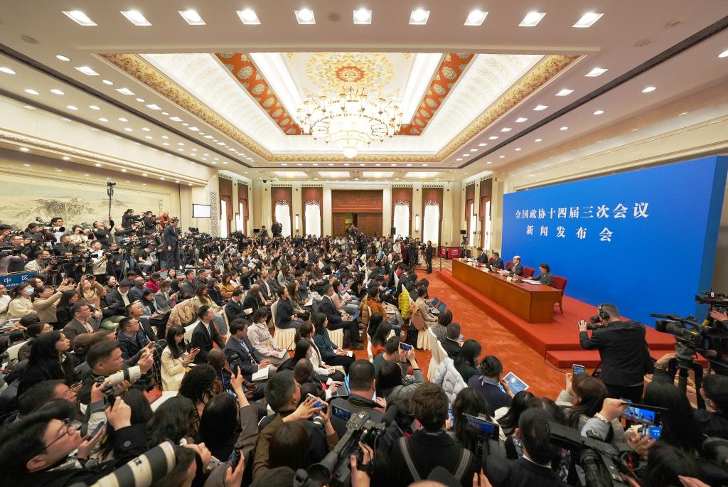 中國人民政治協商會議(政協)第14期全國委員會第3回會議は3日、北京の人民大會堂で記者會見を開いた。同會議の劉結一(りゅう・けついち)報道官が國內外のメディアに向け、今回の會議について説明し、記者の質問に答えた。(北京=新華社記者/金良快)