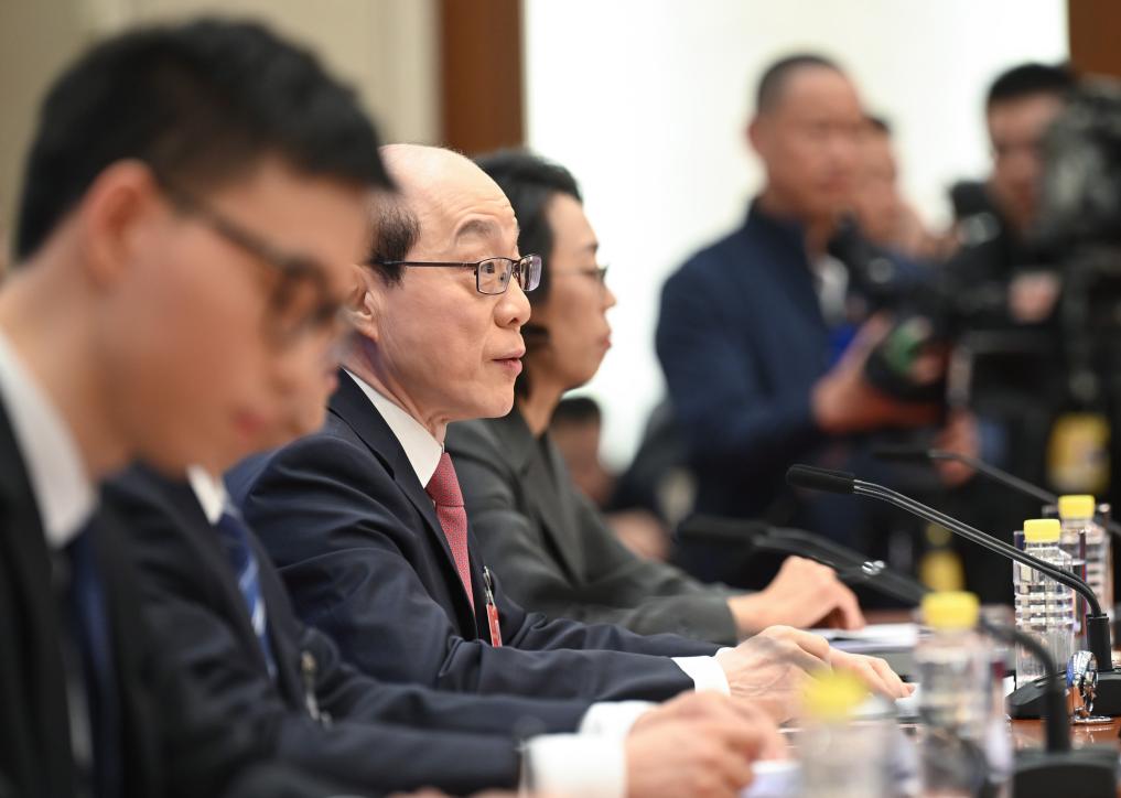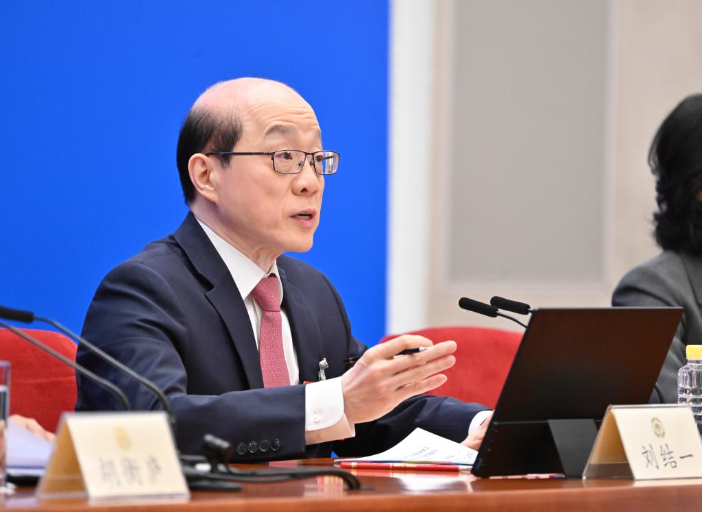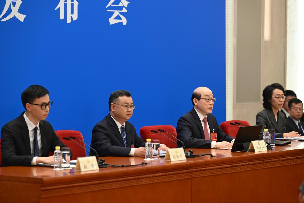 中國人民政治協商會議(政協)第14期全國委員會第3回會議は3日、北京の人民大會堂で記者會見を開いた。同會議の劉結一(りゅう・けついち)報道官が國內外のメディアに向け、今回の會議について説明し、記者の質問に答えた。(北京=新華社記者/才揚)pagebreak