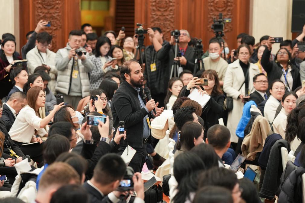 中國人民政治協商會議(政協)第14期全國委員會第3回會議は3日、北京の人民大會堂で記者會見を開いた。同會議の劉結一(りゅう・けついち)報道官が國內外のメディアに向け、今回の會議について説明し、記者の質問に答えた。寫真は記者會見の會場で質問する記者。(北京=新華社記者/才揚)pagebreak
