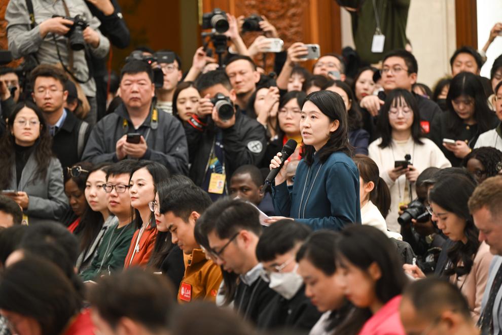 中國人民政治協商會議(政協)第14期全國委員會第3回會議は3日、北京の人民大會堂で記者會見を開いた。同會議の劉結一(りゅう・けついち)報道官が國內外のメディアに向け、今回の會議について説明し、記者の質問に答えた。寫真は記者會見の會場で質問する記者。(北京=新華社記者/金良快)pagebreak