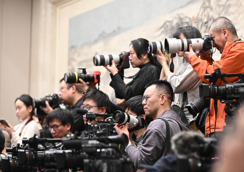中國人民政治協商會議(政協)第14期全國委員會第3回會議は3日、北京の人民大會堂で記者會見を開いた。同會議の劉結一(りゅう・けついち)報道官が國內外のメディアに向け、今回の會議について説明し、記者の質問に答えた。寫真は記者會見の會場で取材する記者。(北京=新華社記者/金良快)pagebreak