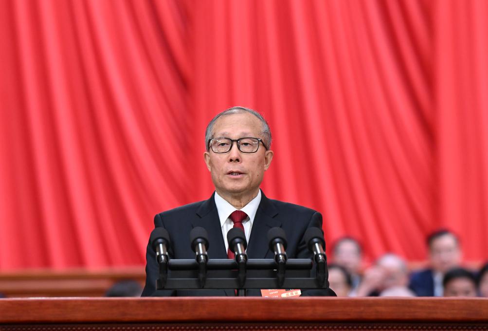 中國の第14期全國人民代表大會(全人代)第3回會議の開幕會議が5日、北京の人民大會堂で開かれた。李鴻忠(り・こうちゅう)全人代常務委員會副委員長が同委員會の委託を受け、「中華人民共和國全國人民代表大會と地方各級人民代表大會代表法(改正草案)」について説明を行った。(北京=新華社記者/張領)