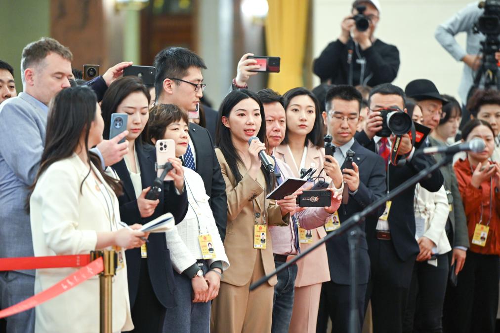 中國の第14期全國人民代表大會(全人代)第3回會議は8日、北京の人民大會堂で2回目の「部長通路」を行った。寫真は會場で取材する記者たち。(北京=新華社記者/胥氷潔)