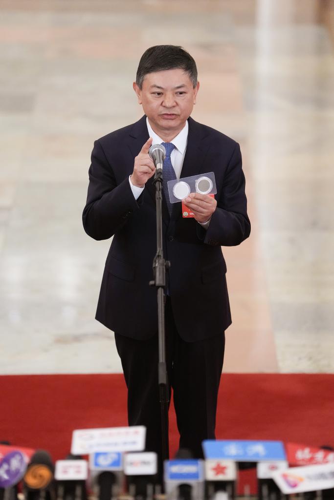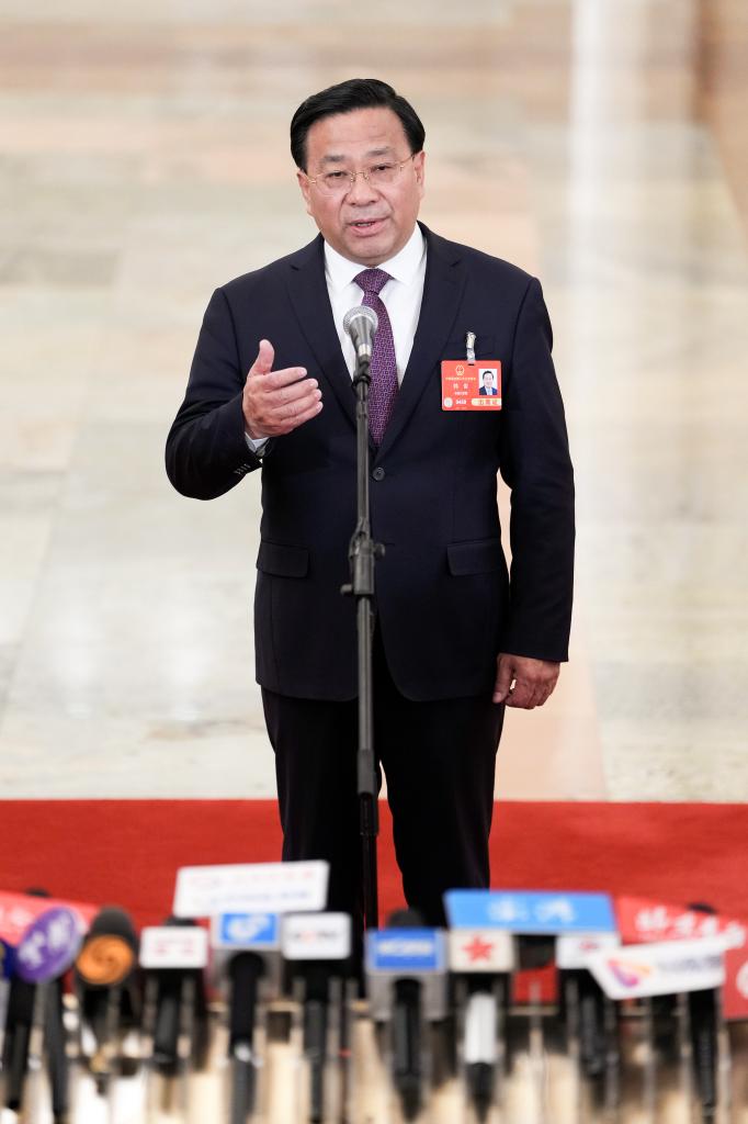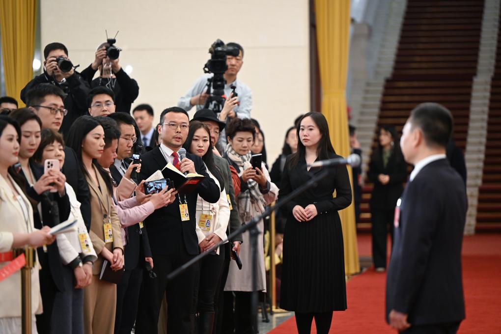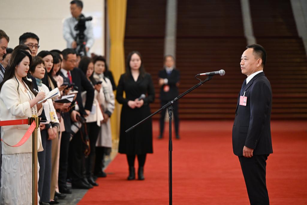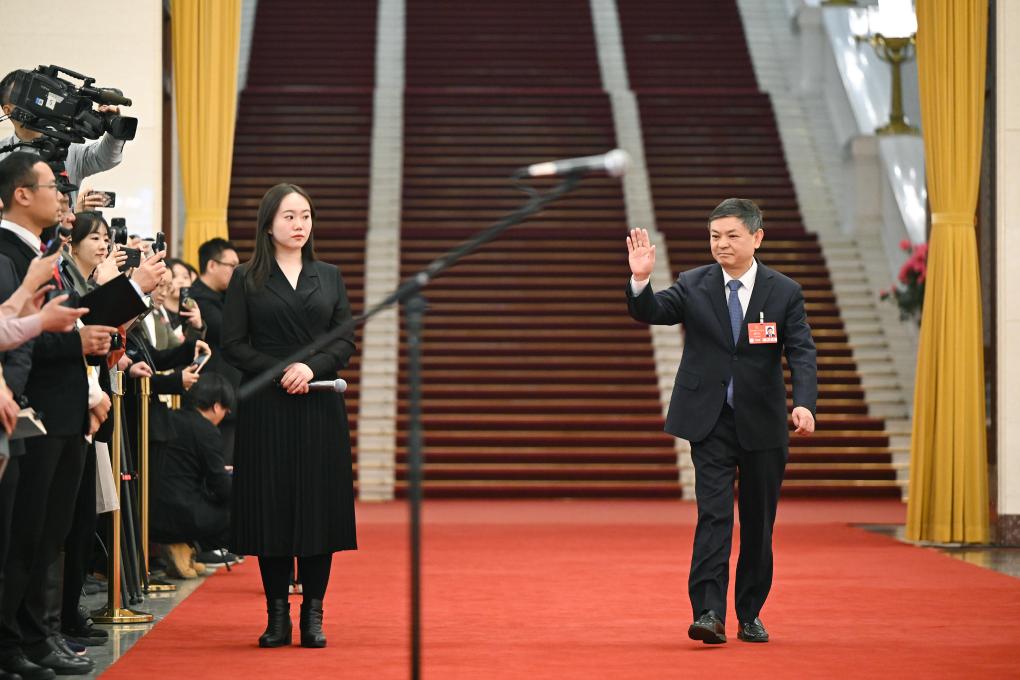中國の第14期全國人民代表大會(全人代)第3回會議は8日、北京の人民大會堂で2回目の「部長通路」を行った。寫真は取材に応じる李國英(り・こくえい)水利部長。(北京=新華社記者/胥氷潔)
